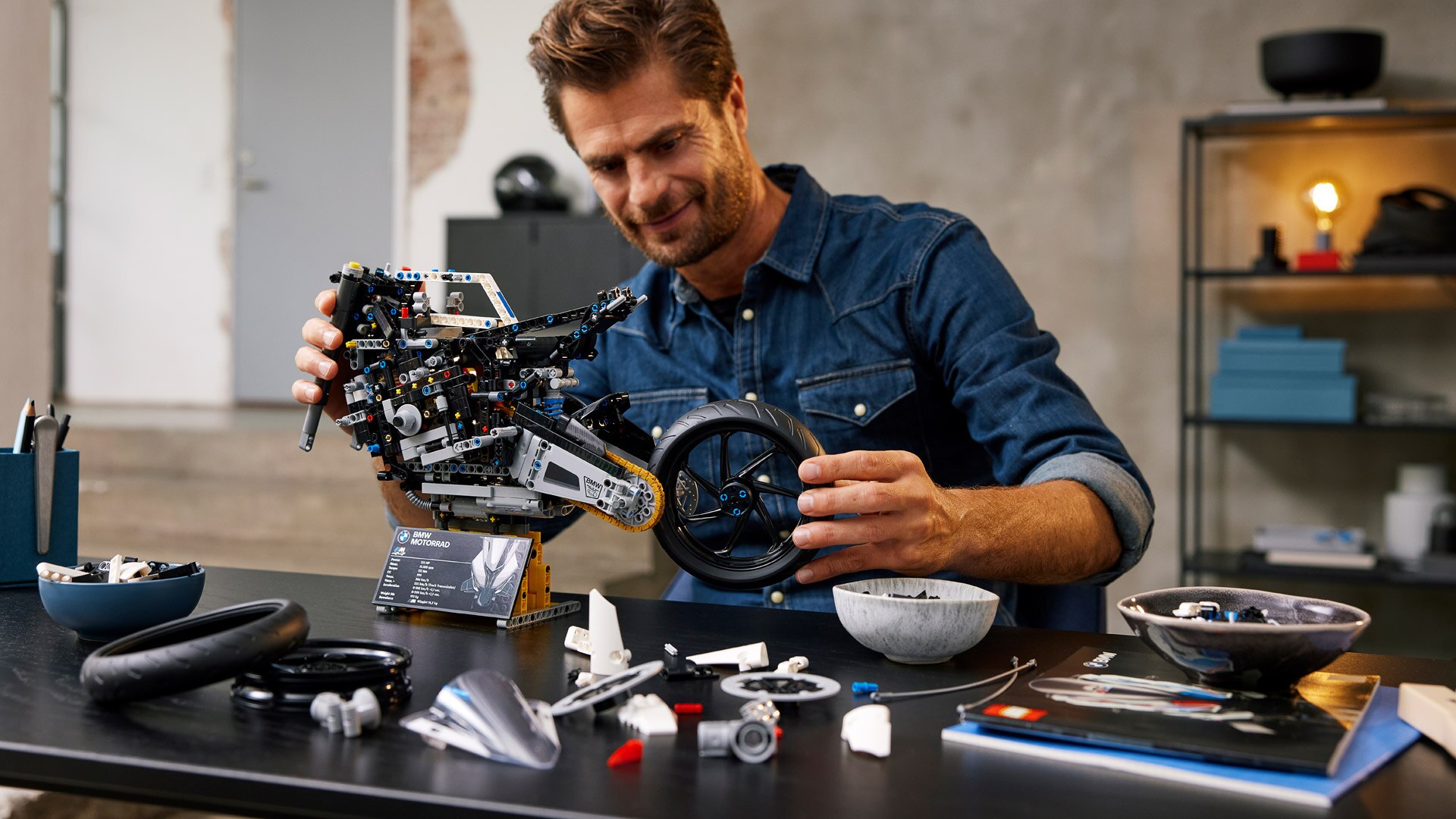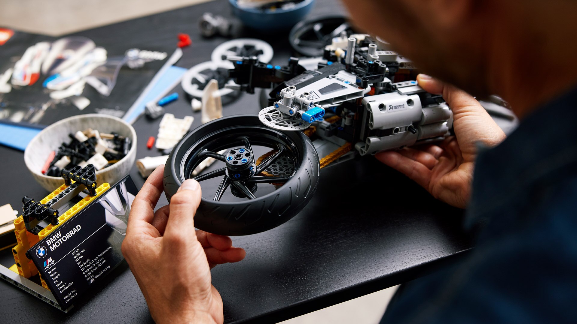 De fascinatie van het origineel drijft je aan. Een passie die je beheerst. Voor jou telt elk detail, elke millimeter, elke techniekfeature. Dit gevoel koester je en beleef je op de weg, op de racetrack en nu eindelijk ook thuis: In nauwe samenwerking met de designers van LEGO® Technic ontstond zo het tot nu toe grootste LEGO® Technic motorfietsmodel en het eerste M LEGO® model ooit: De LEGO® Technic M RR op schaal 1:5. De opgave was duidelijk – uiterste precisie om het onmogelijke mogelijk te maken. Als onderdelen niet aan de strenge eisen voldeden, werden ze opnieuw ontwikkeld. Niet anders dan bij het origineel. Want daarvoor staat precies: Born on the racetrack. Build at home.